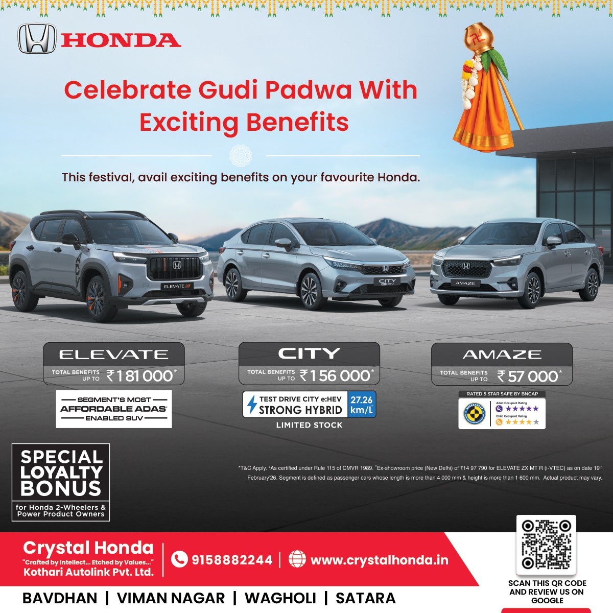 #GudiPadwa #HondaElevate #HondaCity #HondaAmaze #CrystalHonda #FestiveOffers #YearEndBonanza #DriveHonda #NewCarCelebration @Location Bavdhan is a prime residential area in West Pune, known for its greenery and proximity to the Mumbai-Bengaluru Highway. It is surrounded by several prominent residential and commercial hubs.
